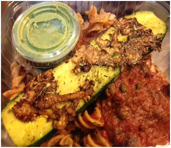 PLATE 1: Grilled Zucchini n’ Puttanesca Plate- Grilled herbed zucchini served over Pasta Puttanesca sauce –tomato sauce simmered with black olives, onions, capers, garlic and fresh basil sprinkled with homemade nut ‘parma cheeze’ plus side of parsley-walnut pesto 11 points per quart