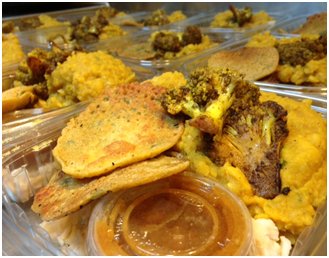 PLATE 1: Indian Plate:Brown basmati rice with toasted cashews and cilantro topped red split pea garlic dahl served with scallion-chickpea chapatti, grilled broccoli, plus cashew-cardamom cream 13 points per container F