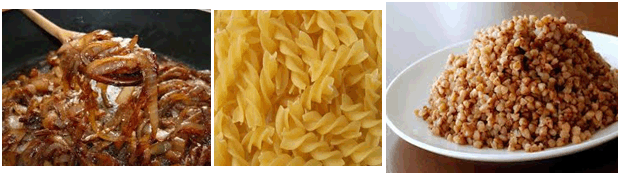 buckwheat tossed with rice pasta and caramelized onions topped with