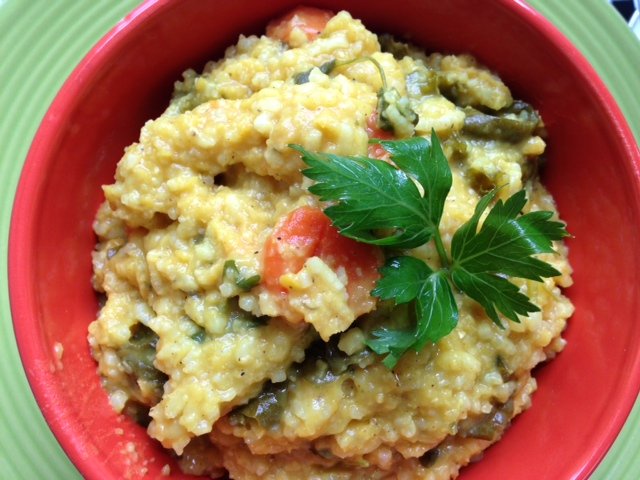 MILLET PIE: Creamy Millet with Grilled Broccoli- herb infused creamy millet polenta topped with grilled broccoli drizzled with EVOO sauteed garlic and shallots sprinkled with roasted red pepper and toasted pine nuts 8 points per container (F this dish freezes well but releases water when drained/reheated …but still delicious)