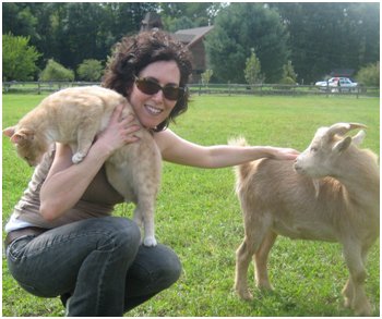 Roni Shapiro, head chef and owner HGTG with some critters at Woodstock Farm Animal Sanctuary